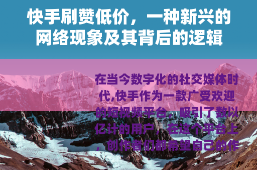 在当今数字化的社交媒体时代,快手作为一款广受欢迎的短视频平台,吸引了数以亿计的用户,在这个平台上,创作者们都希望自己的作品能够获得更多的点赞,从而提高曝光度和影响力,而“快手刷赞低价”这一现象也随之应运而生,成为了许多人关注的焦点。