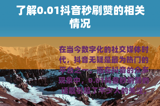 在当今数字化的社交媒体时代,抖音无疑是最为热门的平台之一,而在抖音的众多现象中,0.01抖音秒刷赞的话题引起了不少人的关注。