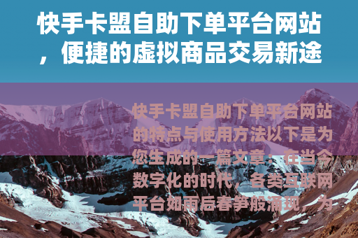 在当今数字化的时代,各类互联网平台如雨后春笋般涌现,为人们的生活和工作带来了极大的便利,快手卡盟自助下单平台网站作为一种新兴的虚拟商品交易平台,正逐渐受到越来越多用户的关注和喜爱。