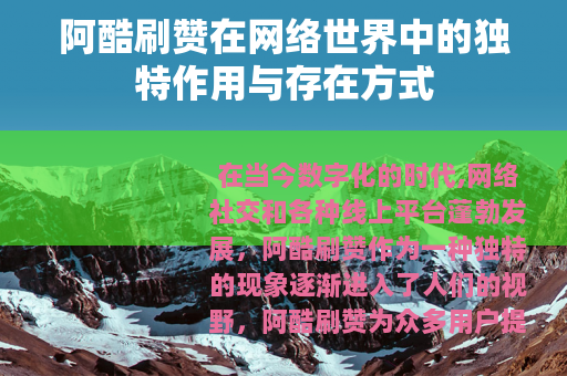 在当今数字化的时代,网络社交和各种线上平台蓬勃发展,阿酷刷赞作为一种独特的现象逐渐进入了人们的视野。