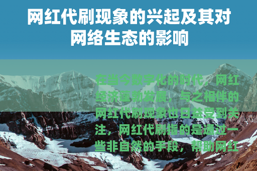 网红代刷现象虽然目前在网络世界中较为普遍,但它绝不是一种值得推崇的行为,各方应该共同努力,让网红经济在健康、有序的轨道上发展,为用户带来更多有价值、有意义的内容和体验,推动网络文化的繁荣和进步,我们才能真正享受到互联网发展带来的红利,构建一个充满活力和创造力的网络社会。