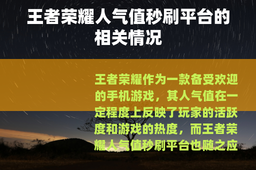 王者荣耀作为一款备受欢迎的手机游戏,其人气值在一定程度上反映了玩家的活跃度和游戏的热度,而王者荣耀人气值秒刷平台也随之应运而生,成为了一些玩家关注的焦点。