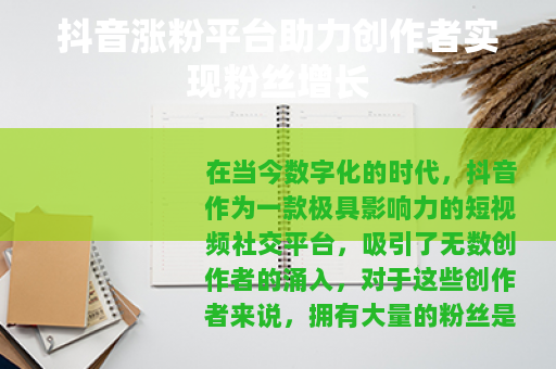 在当今数字化的时代,抖音作为一款极具影响力的短视频社交平台,吸引了无数创作者的涌入,对于这些创作者来说,拥有大量的粉丝是实现自身价值和商业变现的重要基础,而抖音涨粉平台的出现,为他们提供了一个新的途径来加速粉丝增长的进程。