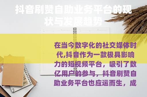 在当今数字化的社交媒体时代,抖音作为一款极具影响力的短视频平台,吸引了数亿用户的参与,抖音刷赞自助业务平台也应运而生,成为了一个备受关注的现象。