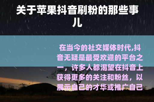 在当今的社交媒体时代,抖音无疑是最受欢迎的平台之一,许多人都渴望在抖音上获得更多的关注和粉丝,以展示自己的才华或推广自己的业务,而对于苹果用户来说,也有不少人在探索如何在抖音上快速增加粉丝数量的方法,其中就包括苹果抖音刷粉这一现象。