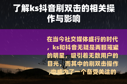 在当今社交媒体盛行的时代,ks和抖音无疑是两颗璀璨的明星,吸引着无数用户的目光,而其中的刷双击操作,也成为了一个备受关注的话题。