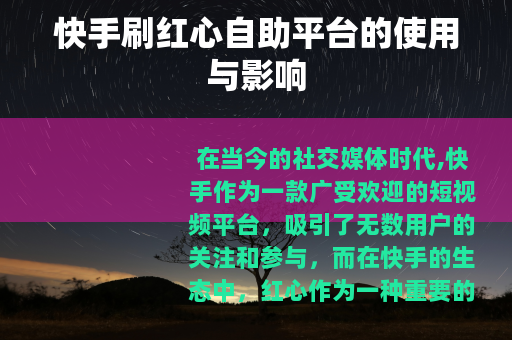 在当今的社交媒体时代,快手作为一款广受欢迎的短视频平台,吸引了无数用户的关注和参与,而在快手的生态中,红心作为一种重要的互动标识,代表着用户对视频内容的喜爱和认可,为了获得更多的红心,一些快手刷红心自助平台应运而生。