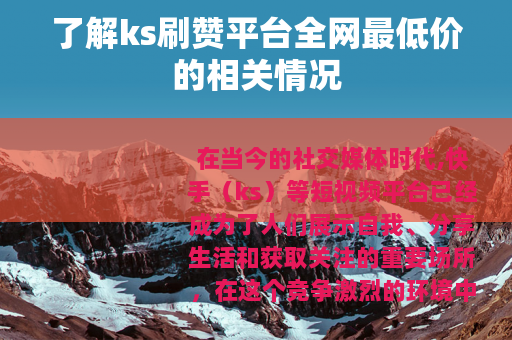在面对ks刷赞平台全网最低价这样的诱惑时,用户们应该保持清醒的头脑,权衡利弊,不要盲目追求虚假的点赞数,要始终牢记,只有通过不断努力提高自己的创作水平,用心制作出有价值的作品,才能在快手平台上获得真正的认可和成功,我们才能共同营造一个健康、积极、公平的社交媒体创作环境,让每一个有才华的创作者都能在这个平台上绽放光彩,实现自己的梦想。