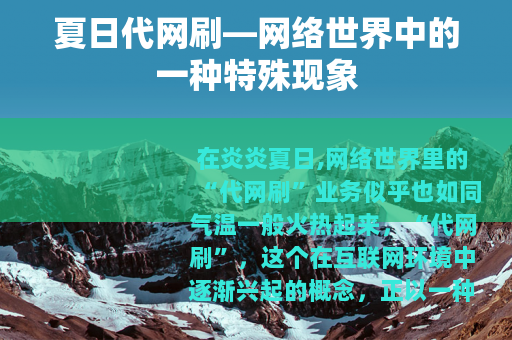 在炎炎夏日,网络世界里的“代网刷”业务似乎也如同气温一般火热起来。“代网刷”,这个在互联网环境中逐渐兴起的概念,正以一种独特的方式影响着部分网络领域的生态。