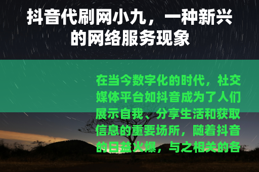 在当今数字化的时代,社交媒体平台如抖音成为了人们展示自我、分享生活和获取信息的重要场所,随着抖音的日益火爆,与之相关的各类服务也应运而生,其中抖音代刷网小九就是备受关注的一种。