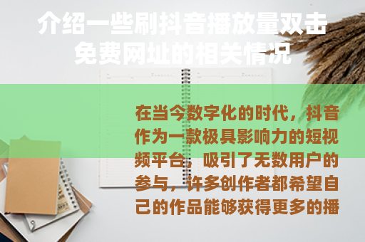 在当今数字化的时代,抖音作为一款极具影响力的短视频平台,吸引了无数用户的参与,许多创作者都希望自己的作品能够获得更多的播放量和双击点赞,从而提升自己在平台上的知名度和影响力,在这样的需求下,一些声称可以提供刷抖音播放量双击免费网址的信息开始在网络上流传。