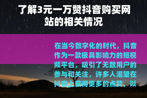 在当今数字化的时代,抖音作为一款极具影响力的短视频平台,吸引了无数用户的参与和关注,许多人渴望在抖音上获得更多的点赞,以提升自己作品的热度和知名度,而市场上也随之出现了一些声称可以提供低价点赞服务的网站,其中就有3元一万赞的抖音购买网站。