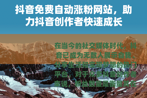 在当今的社交媒体时代,抖音已成为无数人展示自我、分享生活和实现梦想的热门平台,对于众多抖音创作者来说,粉丝数量是衡量其在平台上影响力和成功与否的重要指标之一,许多人都在寻找各种方法来增加自己的粉丝量,而抖音免费自动涨粉网站便应运而生,为创作者们提供了一种新的途径和可能。