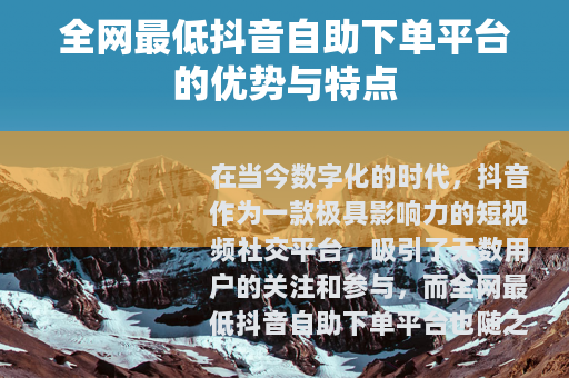 在当今数字化的时代,抖音作为一款极具影响力的短视频社交平台,吸引了无数用户的关注和参与,而全网最低抖音自助下单平台也随之应运而生,为众多抖音用户提供了一种独特的服务体验。
