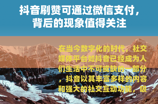 抖音刷赞通过微信支付的现象是一个值得我们深入思考和关注的社会现象,它涉及到平台、用户、社会等多个层面的问题,我们需要以积极的态度去面对和解决这些问题,共同营造一个更加健康、有序、充满活力的社交媒体生态环境,让抖音等平台在数字时代中绽放出更加耀眼的光芒,为人们的生活和社会的发展带来更多的惊喜和收获。
