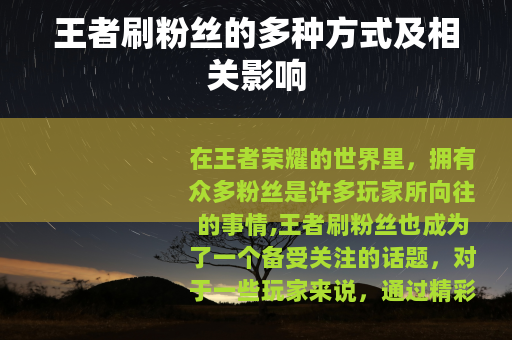王者刷粉丝是一个多维度的现象,它通过不同的方式为玩家、公会和战队带来了更多的关注和支持,同时也为王者荣耀的游戏生态注入了新的活力,让这个游戏世界变得更加丰富多彩。
