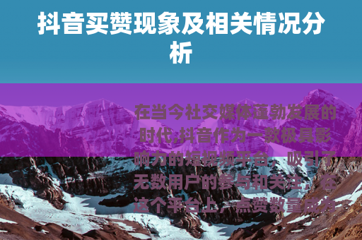 在当今社交媒体蓬勃发展的时代,抖音作为一款极具影响力的短视频平台,吸引了无数用户的参与和关注,在这个平台上,点赞数量成为了衡量一个视频受欢迎程度的重要指标之一,而“买赞抖音赞”的现象也随之悄然兴起。