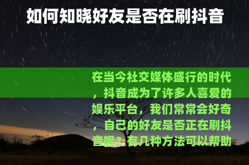 在当今社交媒体盛行的时代,抖音成为了许多人喜爱的娱乐平台,我们常常会好奇,自己的好友是否正在刷抖音呢?有几种方法可以帮助我们了解这一情况。