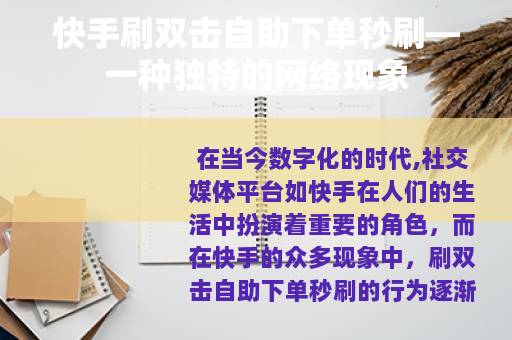在当今数字化的时代,社交媒体平台如快手在人们的生活中扮演着重要的角色,而在快手的众多现象中,刷双击自助下单秒刷的行为逐渐引起了人们的关注。