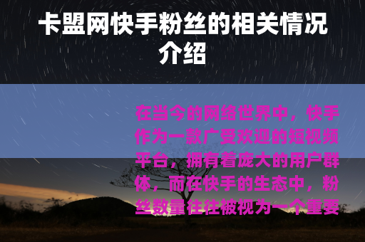 在当今的网络世界中,快手作为一款广受欢迎的短视频平台,拥有着庞大的用户群体,而在快手的生态中,粉丝数量往往被视为一个重要的指标,它不仅关系到创作者的影响力,也在一定程度上影响着其在平台上的发展机会,在这样的背景下,卡盟网快手粉丝这一现象逐渐进入了人们的视野。