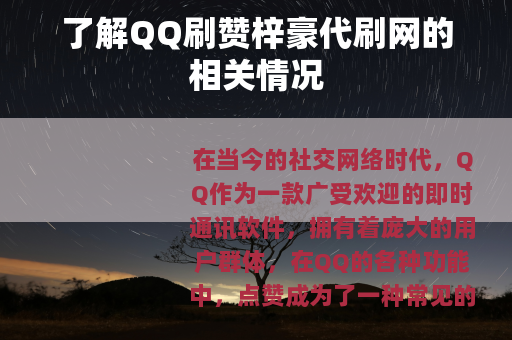 在当今的社交网络时代,QQ作为一款广受欢迎的即时通讯软件,拥有着庞大的用户群体,在QQ的各种功能中,点赞成为了一种常见的社交互动方式,它可以表达对好友动态、说说、照片等的喜爱和支持,而随着社交需求的不断发展,出现了一些如qq刷赞梓豪代刷网这样的平台。
