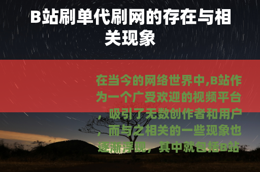 在当今的网络世界中,B站作为一个广受欢迎的视频平台,吸引了无数创作者和用户,而与之相关的一些现象也逐渐浮现,其中就包括B站刷单代刷网。