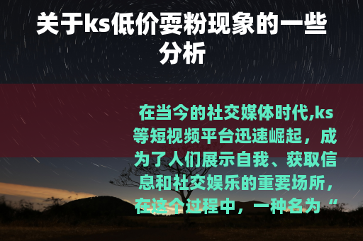 在当今的社交媒体时代,ks等短视频平台迅速崛起,成为了人们展示自我、获取信息和社交娱乐的重要场所,在这个过程中,一种名为“ks低价耍粉”的现象逐渐引起了人们的关注。