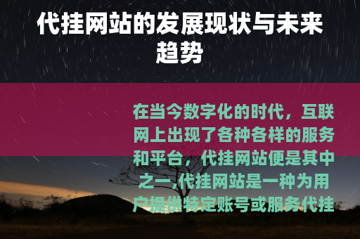 代挂网站作为互联网服务的一种新兴形式,在满足用户需求、创造商业价值等方面具有一定的潜力和发展前景,虽然它在发展过程中面临着一些挑战,但只要能够不断创新和提升自身的技术与服务水平,就有可能在未来的互联网市场中占据一席之地,为用户提供更加便捷、高效的账号代挂服务,同时也为自身的发展赢得更广阔的空间,我们可以期待代挂网站在互联网生态中发挥出更大的作用,与其他互联网服务共同构建一个更加丰富和多元化的数字世界。