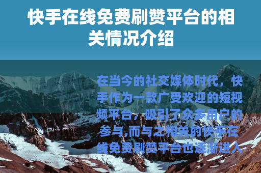 在当今的社交媒体时代,快手作为一款广受欢迎的短视频平台,吸引了众多用户的参与,而与之相关的快手在线免费刷赞平台也逐渐进入了人们的视野。