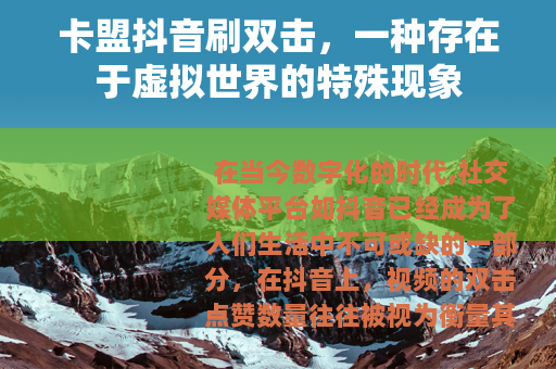在当今数字化的时代,社交媒体平台如抖音已经成为了人们生活中不可或缺的一部分,在抖音上,视频的双击点赞数量往往被视为衡量其受欢迎程度和影响力的重要指标之一,而与之相关的“卡盟抖音刷双击”现象也逐渐进入了人们的视野。
