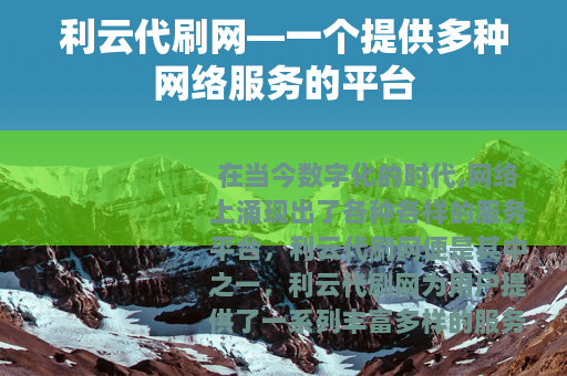 在当今数字化的时代,网络上涌现出了各种各样的服务平台,利云代刷网便是其中之一,利云代刷网为用户提供了一系列丰富多样的服务,满足了不同用户在网络世界中的各种需求。