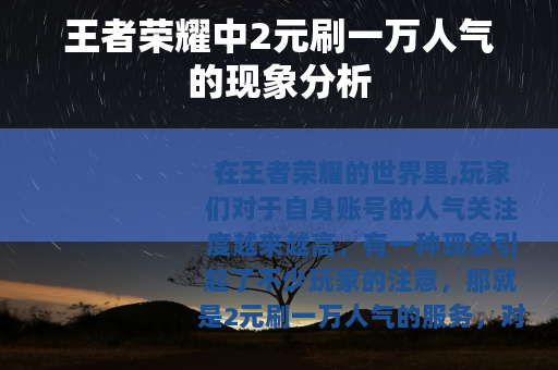 在王者荣耀的世界里,玩家们对于自身账号的人气关注度越来越高,有一种现象引起了不少玩家的注意,那就是2元刷一万人气的服务。