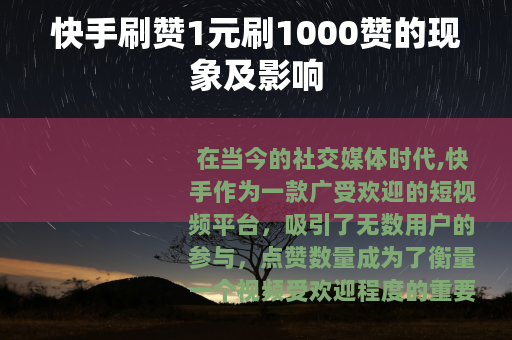 在当今的社交媒体时代,快手作为一款广受欢迎的短视频平台,吸引了无数用户的参与,点赞数量成为了衡量一个视频受欢迎程度的重要指标之一,而“快手刷赞1元刷1000赞”的现象也随之悄然兴起。