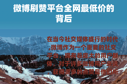 在当今社交媒体盛行的时代,微博作为一个重要的社交平台,拥有着庞大的用户群体,对于许多微博用户来说,获得更多的点赞是他们所追求的目标之一,这不仅能让他们的微博内容得到更多的关注,还能在一定程度上提升自己的影响力,而在这样的需求下,微博刷赞平台全网最低价的广告开始在网络上频繁出现。