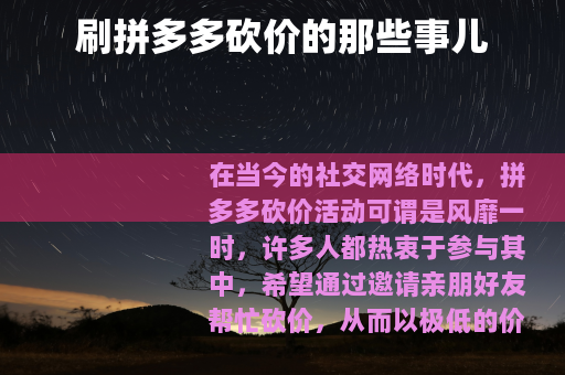 在当今的社交网络时代,拼多多砍价活动可谓是风靡一时,许多人都热衷于参与其中,希望通过邀请亲朋好友帮忙砍价,从而以极低的价格甚至免费获得心仪的商品,而在这个过程中,刷拼多多砍价的现象也逐渐兴起。