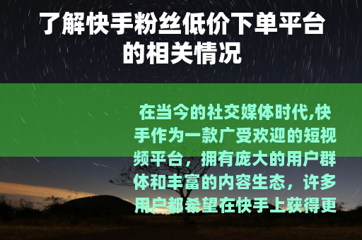 在当今的社交媒体时代,快手作为一款广受欢迎的短视频平台,拥有庞大的用户群体和丰富的内容生态,许多用户都希望在快手上获得更多的关注和粉丝,以展示自己的才华、分享生活点滴或推广自己的产品和服务,在这种需求的推动下,一些所谓的快手粉丝低价下单平台应运而生。
