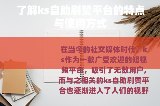 在当今的社交媒体时代,ks作为一款广受欢迎的短视频平台,吸引了无数用户,而与之相关的ks自助刷赞平台也逐渐进入了人们的视野。