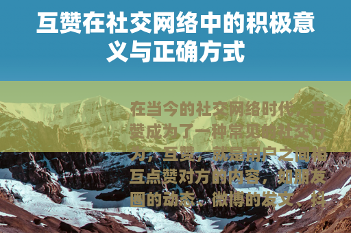 互赞在社交网络中具有重要的积极意义,它是一种积极的反馈机制,能够激励我们不断创作;是一种增进社交关系的有效方式,让我们与朋友之间的联系更加紧密;还能够营造积极向上的社交氛围,为我们的社交生活带来更多的快乐和正能量,只要我们能够以真诚的态度和正确的方式去对待互赞,它就能够成为我们社交网络生活中的一抹亮色,为我们的生活增添更多的美好和乐趣,让我们在社交网络中积极地参与互赞,共同构建一个充满温暖、鼓励和正能量的社交空间,让每一个人的努力和付出都能得到应有的认可和赞赏,让每一段友谊都能在互赞的互动中不断加深和升华,在这个信息快速传播的时代,互赞或许只是一个小小的举动,但它所蕴含的力量却不容小觑,它能够让我们的社交网络世界变得更加丰富多彩,让我们的生活变得更加美好和有意义。