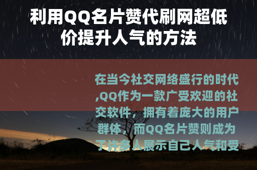 在当今社交网络盛行的时代,QQ作为一款广受欢迎的社交软件,拥有着庞大的用户群体,而QQ名片赞则成为了许多人展示自己人气和受欢迎程度的一个重要指标,在这样的背景下,QQ名片赞代刷网超低价的服务应运而生,为众多希望快速提升自己QQ名片赞数量的用户提供了一种便捷的途径。