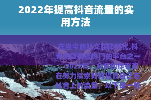 在2022年要提高抖音流量,需要从内容创作、制作质量、功能利用、标题封面以及发布频率等多个方面入手,不断优化和改进自己的运营策略,才能在竞争激烈的抖音平台上获得更多的关注和流量。