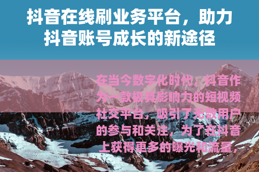 在当今数字化时代,抖音作为一款极具影响力的短视频社交平台,吸引了无数用户的参与和关注,为了在抖音上获得更多的曝光和流量,许多用户开始寻求各种方式来提升自己账号的活跃度和影响力,而抖音在线刷业务平台,便在这样的需求下应运而生,为用户提供了一系列有助于账号发展的服务。