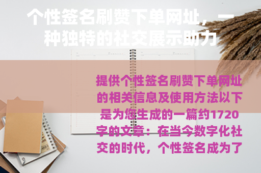 个性签名刷赞下单网址的出现,其实是顺应了社交网络发展的潮流,在众多社交平台上,用户们都希望自己的每一个表达都能得到他人的认可和喜爱,个性签名作为一种简洁而有力的自我展示方式,其重要性不言而喻,一个独特且备受点赞的个性签名,能够让他人在第一时间对我们产生兴趣,进而愿意深入了解我们的生活、思想和价值观。