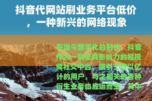 在当今数字化的时代,抖音作为一款极具影响力的短视频社交平台,吸引了数以亿计的用户,与之相关的各种衍生业务也应运而生,其中抖音代网站刷业务平台以其低价的特点,在网络上引起了一定的关注。
