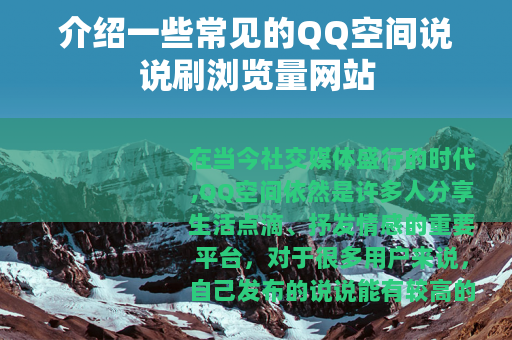 在当今社交媒体盛行的时代,QQ空间依然是许多人分享生活点滴、抒发情感的重要平台,对于很多用户来说,自己发布的说说能有较高的浏览量是一件令人开心的事情,这也促使了一些QQ空间说说刷浏览量网站的出现。
