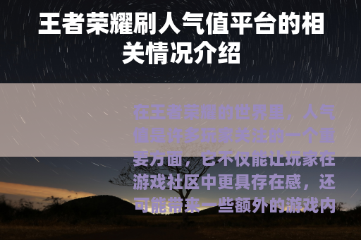 王者荣耀刷人气值平台的存在是一个复杂的现象,它既反映了玩家对于人气值的重视和追求,也凸显了游戏生态中存在的一些问题,只有通过玩家和游戏开发商的共同努力,才能营造一个更加公平、健康、有序的游戏环境,让王者荣耀这款游戏能够持续地发展和繁荣下去。 对您有所帮助,您可以根据实际需求进行调整和修改,如果您还有其他问题,欢迎继续向我提问。