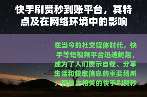在当今的社交媒体时代,快手等短视频平台迅速崛起,成为了人们展示自我、分享生活和获取信息的重要场所,而与之相关的快手刷赞秒到账平台也应运而生,在网络世界中引起了一定的关注。