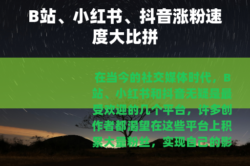 在当今的社交媒体时代,B站、小红书和抖音无疑是最受欢迎的几个平台,许多创作者都渴望在这些平台上积累大量粉丝,实现自己的影响力和价值,B站、小红书和抖音哪个涨粉快呢?这是一个备受关注的问题。