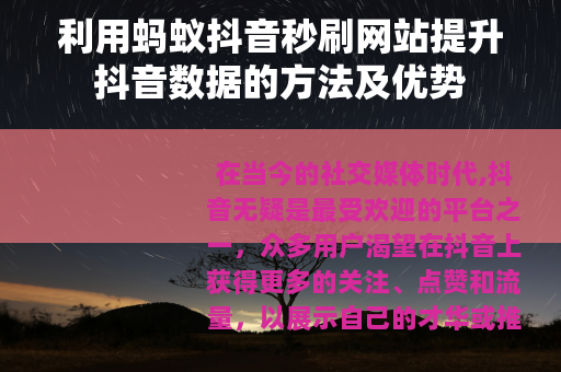 在当今的社交媒体时代,抖音无疑是最受欢迎的平台之一,众多用户渴望在抖音上获得更多的关注、点赞和流量,以展示自己的才华或推广自己的产品与服务,而蚂蚁抖音秒刷网站的出现,为用户提供了一种新的途径来提升抖音数据。