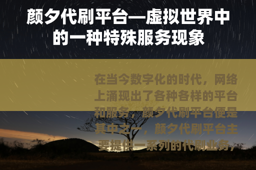 在当今数字化的时代,网络上涌现出了各种各样的平台和服务,颜夕代刷平台便是其中之一,颜夕代刷平台主要提供一系列的代刷业务,在虚拟的网络空间中有着独特的存在方式。