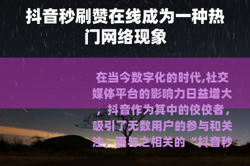 在当今数字化的时代,社交媒体平台的影响力日益增大,抖音作为其中的佼佼者,吸引了无数用户的参与和关注,而与之相关的“抖音秒刷赞在线”服务也逐渐走进了人们的视野,成为了一个备受讨论的话题。